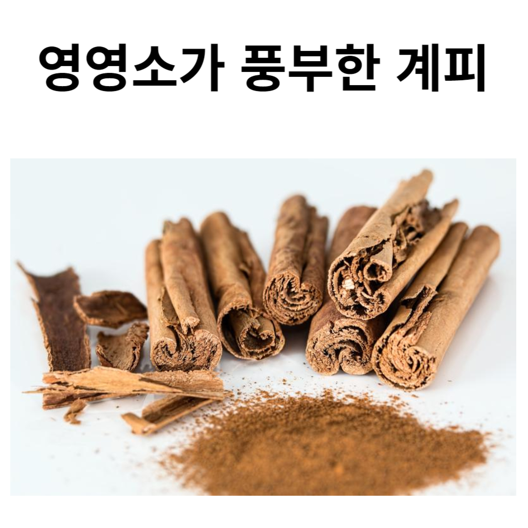 계피에는 우리 몸에 필요한 필수 영양소가 많이 포함되어 있습니다. 망간, 철, 칼슘과 같은 영양소가 우리 몸에 다양한 효능은 몸을 건강하게 해 줍니다. 중추 신경계를 진정시켜 줍니다. 흥분을 진정시키고 혈류의 흐름을 왕성하게 하여 장기의 기능을 촉진시켜 줍니다. 날씨가 추워지면 관절염이나 신경통이 있는 사람은 날씨가 추워지거나 흐려지면 통증이 심해집니다. 허리나 무릎이 차고 시린 증상을 완화시켜 주고 통증의 강도를 낮추어줍니다. 출산 후에 출혈이 계속되는 증상을 개선시켜 줍니다. 말초혈관의 확장 작용이 있어서 혈소판의 응집을 억제해 주어 혈압이 떨어지도록 도와줍니다. 인슐린 민감성과 혈당 조절 기능을 향상해 주어 혈당을 조절하는 효과가 있으며 당뇨병 예방에 도움이 됩니다. 특히 감기 예방에 효과적이며 면역력을 강하게 해 줍니다. 혈액순환을 촉진해 주고 수족냉증 개선에 도움이 됩니다. 항산화 제가 풍부하여 체내 활성산소를 중화시켜 줍니다. 세포 손상을 일으키고 노화와 다양한 질병을 유발하는 인자를 줄여줍니다. 천연 항균 및 항진균 특성이 있어서 곰팡이와 박테리아를 퇴치하는데 도움을 주며 감염의 위험을 줄이는데 도움이 될 수 있습니다. 혈당 수치를 조절하고 식욕을 억제하는데 도움을 줍니다. 계피의 향과 맛이 기분에 긍정적인 영향을 주어 기분과 주의력을 향상해 줍니다. 복부에 가스와 복부팽만감을 줄여주어 소화 기능을 개선해 주고 소화장애가 있거나 복통, 설사가 있을 때 효능이 있습니다. 계피에 항암 특성이 있어서 암세포의 발달과 확산을 예방하는데 도움이 될 수 있습니다.
