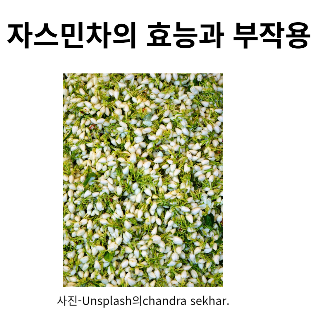 자스민차는 심혈관 건강에 효능이 있습니다. 나쁜 콜레스테롤인 LDL의 수치를 낮추어줍니다. 카테킨 성분이 풍부하여 혈액의 산화를 억제해 주고 노폐물을 분해시켜 혈액순환이 잘 일어날 수 있게 합니다. 동맥경화나 고혈압과 같은 혈관 질환의 예방에 도움을 줍니다. 항산화 성분도 풍부합니다. 우리 몸의 노화를 촉진하는 활성 산소를 억제하고 유해물질을 제거하는 효능이 있습니다. 기름진 음식이나 탄수화물을 많이 섭취하는 사람들에게는 활성 산소가 많이 생길 수 있습니다. 자스민차를 마시면서 이런 음식을 먹으면 활성 산소를 억제하는데 도움이 됩니다. 폴리페놀 성분 중에 에피갈로카네틴갈레트가 암세포의 증식을 막아주는 효능이 뛰어납니다. 이 차는 좋은 꽃향이 특징인데 이러한 향이 신경의 부교감 반응을 일으켜 스트레스를 해소해 주고 우울증을 예방해 주는 효능이 있습니다. 신경안전제 효과가 있어서 스트레스나 우울증으로 고통받는 사람들에게 도움이 됩니다. 입냄새를 제거해 주는 효능이 있습니다. 항균 및 탈취효과가 있어서 입냄새 제거에 도움이 됩니다. 여러 종류의 비타민이 풍부하여 피부의 탄력을 높여주고 보습에도 도움을 줍니다. 피부질환과 트러블을 완화시켜 주는 효능이 있습니다. 그래서 화장품의 재료로 사용되기도 합니다. 여자들에게는 생리불순이나 생리통등의 증상을 개선시켜 주는 효능이 있습니다. 특히 갱년기, 폐경기 여성의 각종 증상과 혈압을 개선시켜 줍니다. 집중력과 기억력에도 도움이 됩니다. 향이 주는 자극이 기억력과 집중력 향상에 도움이 됩니다. 테아닌 성분이 집중력을 도와 수험생과 학생들에게 효과가 있습니다. 카페인 성분이 라파아제를 활성화시켜 지방분해를 촉진합니다. 카테킨이 위장건강을 개선시키고 위장병을 예방해 줍니다.
